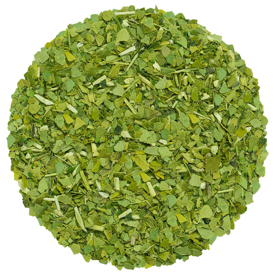 Grüner Mate Tee. Der Wachmacher unter den Matemischungen besteht fast ausschließlich aus kleinen Stückchen des Mateblatts. Genau in diesen befindet sich das Koffein, welches sich in den Aufgüssen entfaltet und die für einen Teil der anregenden Wirkung verantwortlich ist. Der Geschmack ist etwas klarer und intensiver als bei Mischungen mit Mateästen und die Wirkung ist stärker. Dieser Blattschnitt ist bestens für normale Teesiebe, das Teeei oder die French Press geeignet, man kann sie aber auch traditionell mit Kalebasse und Bombilla aufgießen.